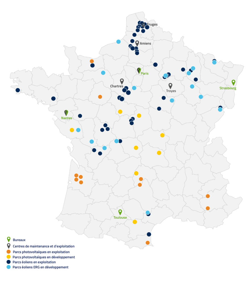 ERG France fait partie du groupe ERG, présent en Europe, où nous possédons et exploitons des parcs éoliens et solaires d’une puissance totale de 3,7 GW. Producteur européen d’énergie renouvelable, nous opérons avec succès dans le secteur énergétique depuis 80 ans et figurons parmi les leaders européens.