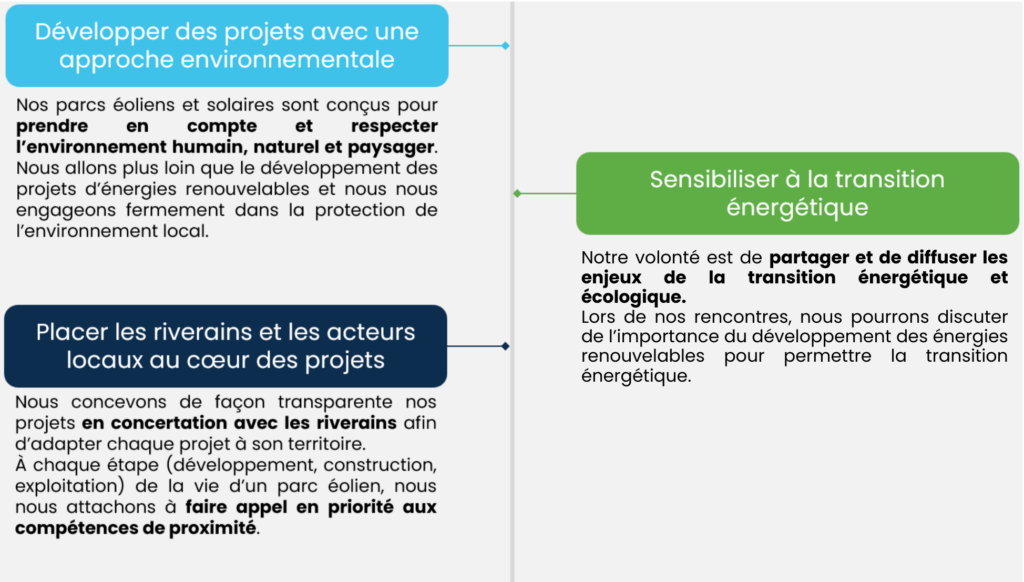 Le développement de nos projets éoliens s’appuie sur un engagement fort auprès des territoires, en assurant l’implication des collectivités locales dans l’ensemble des projets et la transparence à chacune des étapes de leur déploiement.